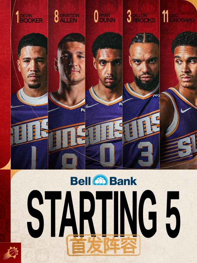 Trước trận đấu, Suns đã chính thức công bố đội hình xuất phát: Booker, Allen, Dunn, Dillon, Iguodaro và thêm "đội hình xuất phát" của Trung Quốc vào hình ảnh.