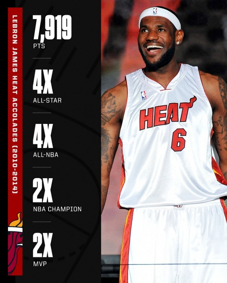 Hôm nay, trung tâm thể thao truyền thông Hoa Kỳ đã tiết lộ thành tích của James trong 4 năm gắn bó với Heat và đặt câu hỏi: "The Heat có nên rút lại chiếc áo số 6 của anh ấy không?"