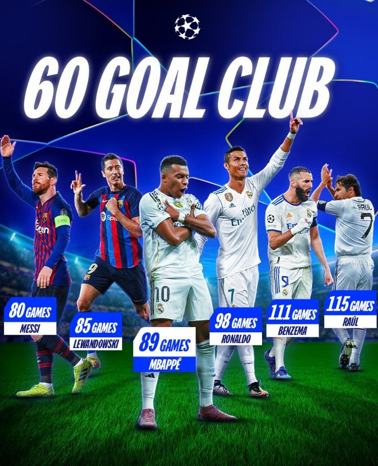quan chức Champions League cũng bao gồm các trò chơi tốn thời gian nhanh nhất để ghi 60 bàn thắng trong lịch sử, như sau: